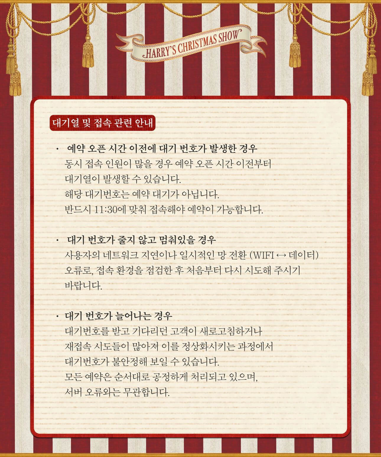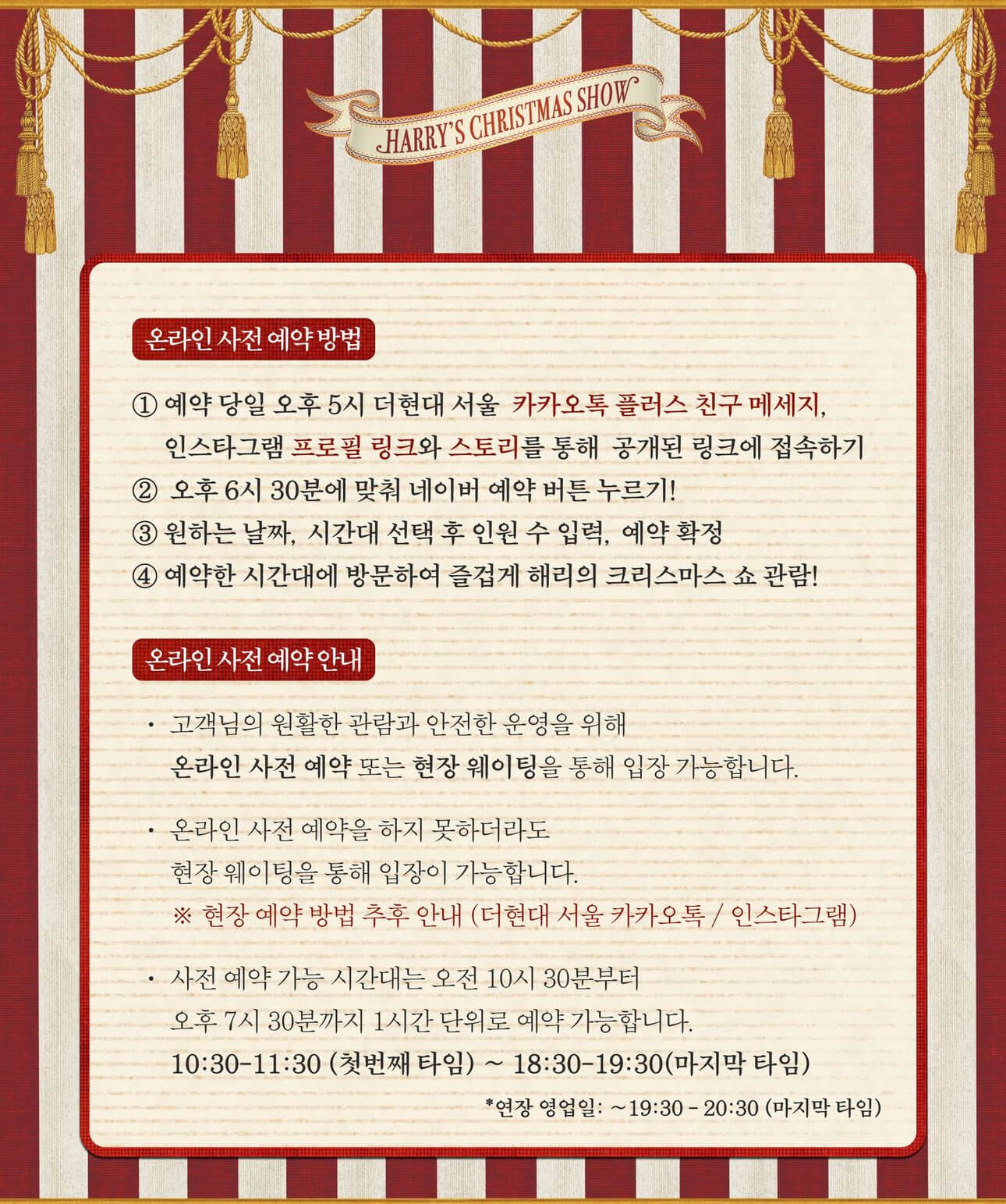 예약은 사전예약제 또는 현장 선착숙 마감재 이며 더현대서울 크리스마스 빌리지 1차 사전예약은 10월 24일 목요일 오후 6시 30분 오픈되어 완료되었습니다.