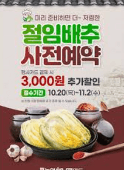 사전예약 시 제공되는 절임배추의 가격은 10kg 기준으로 설정되어 있으며, 행사카드로 결제 시 할인 혜택이 제공됩니다. 할인율은 카드사에 따라 다를 수 있으니, 사전예약 시 확인하는 것이 좋습니다. 또한, 사전예약을 통해 구매하는 고객에게는 추가적인 사은품이나 혜택이 제공될 수 있으니, 놓치지 마세요.
